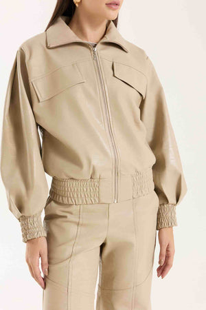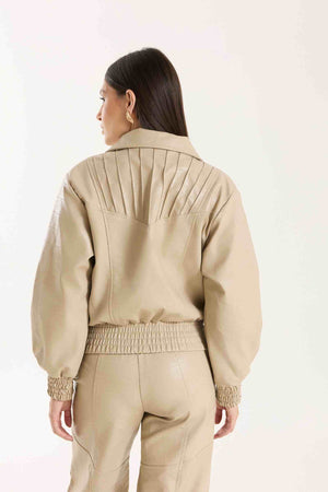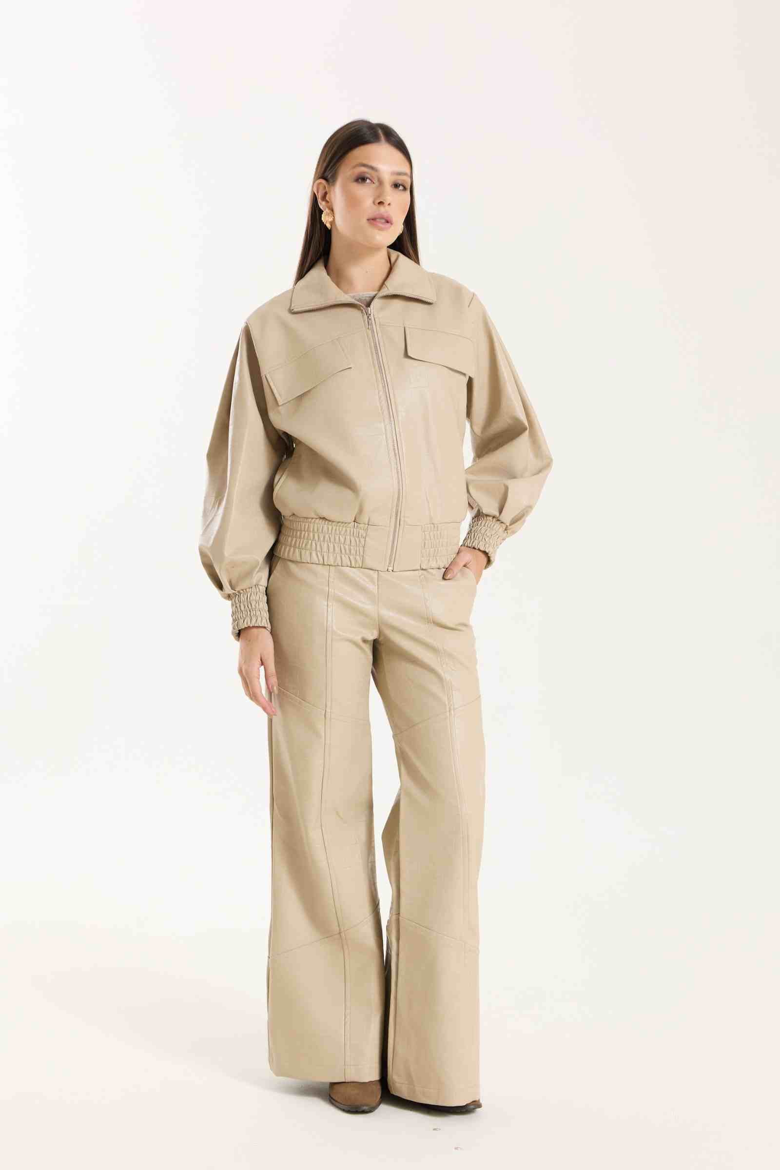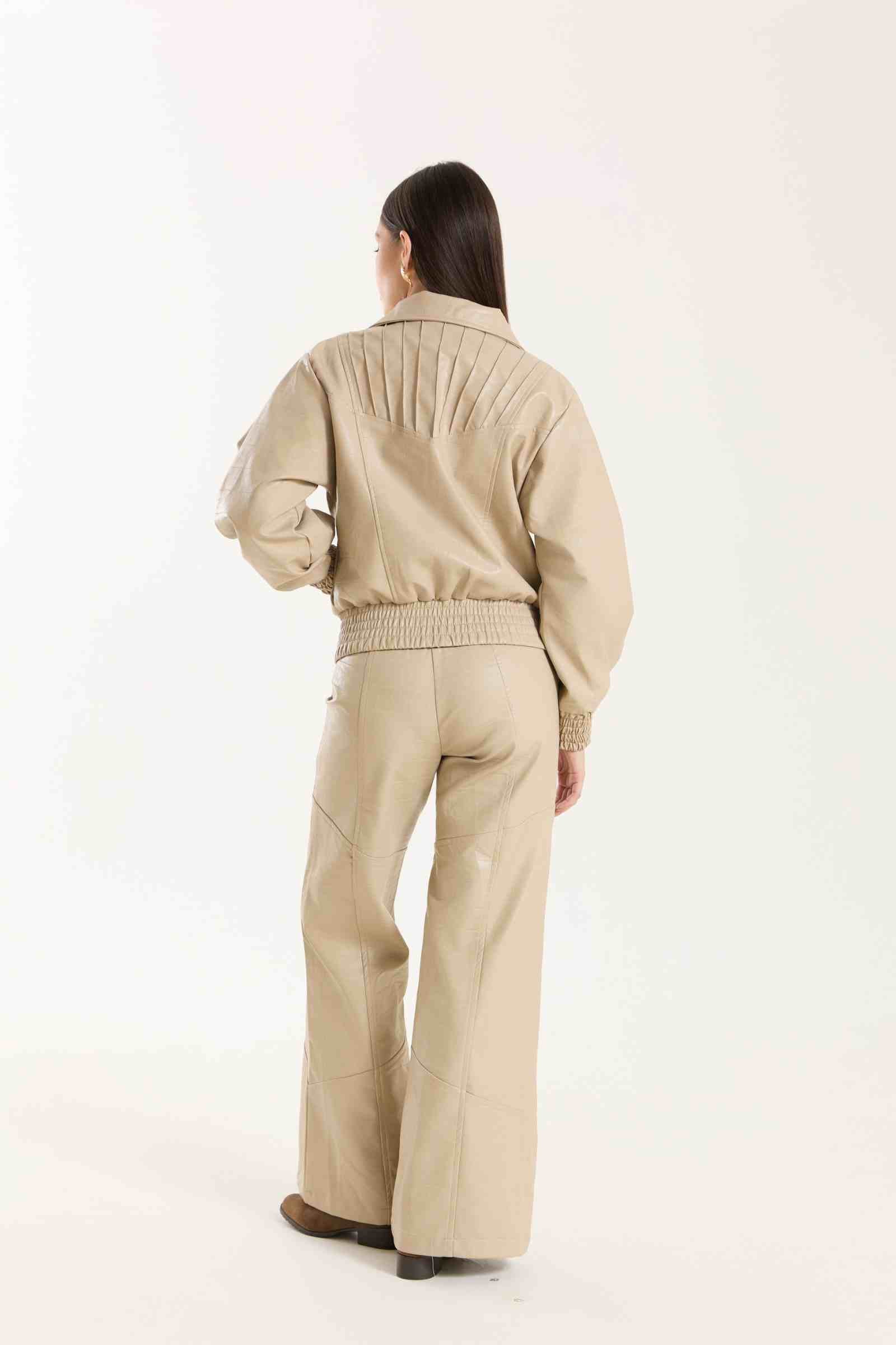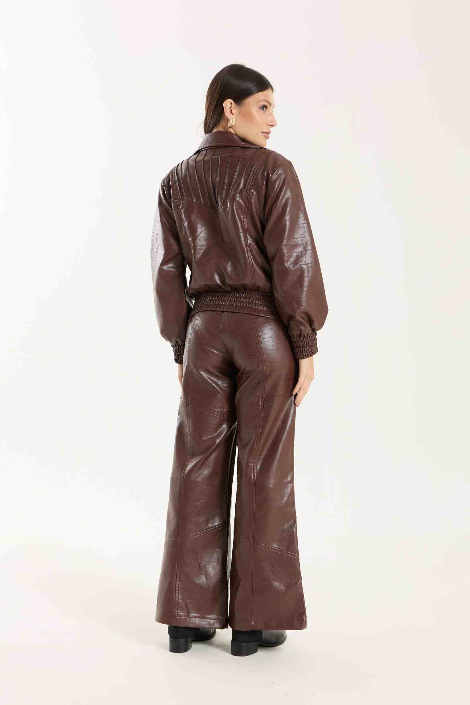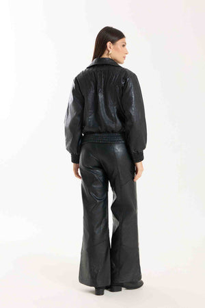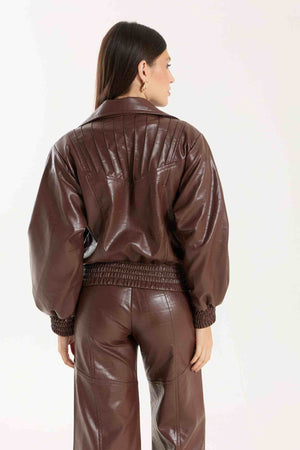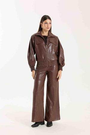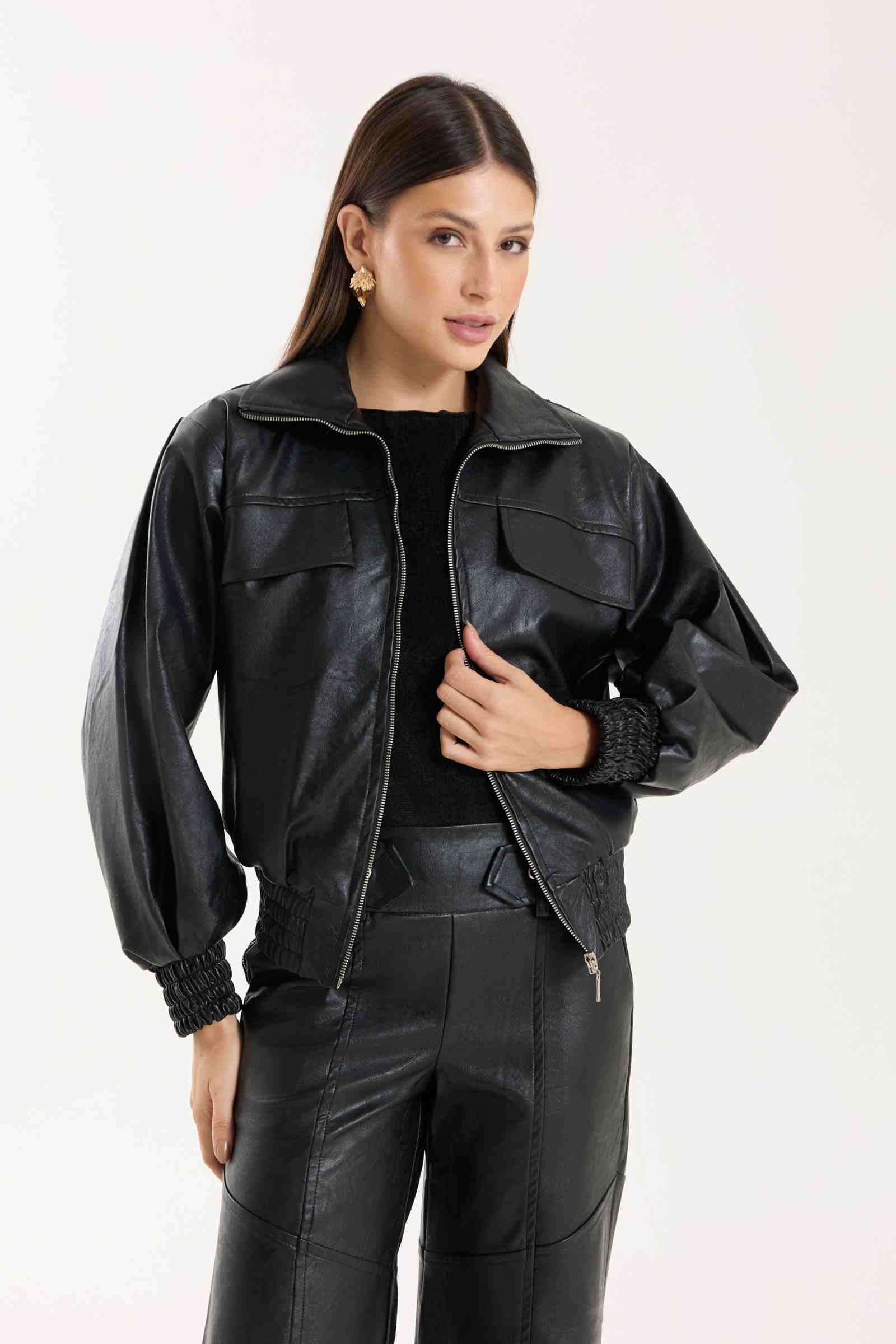 Jaqueta Victoria com modelagem oversized. Possui punhos com lastex, bolsos funcionais e detalhe em nervuras que agregam destaque e identidade à peça. Confeccionada em material com aspecto de couro, com base 100% viscose, oferecendo estrutura e acabamento sofisticado.