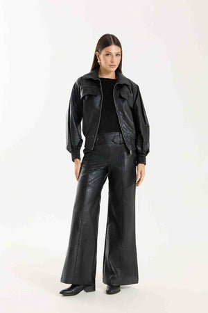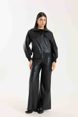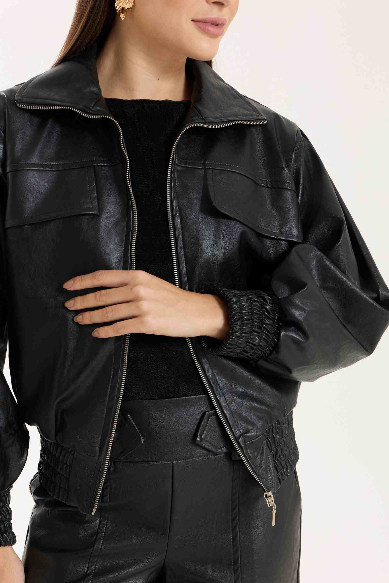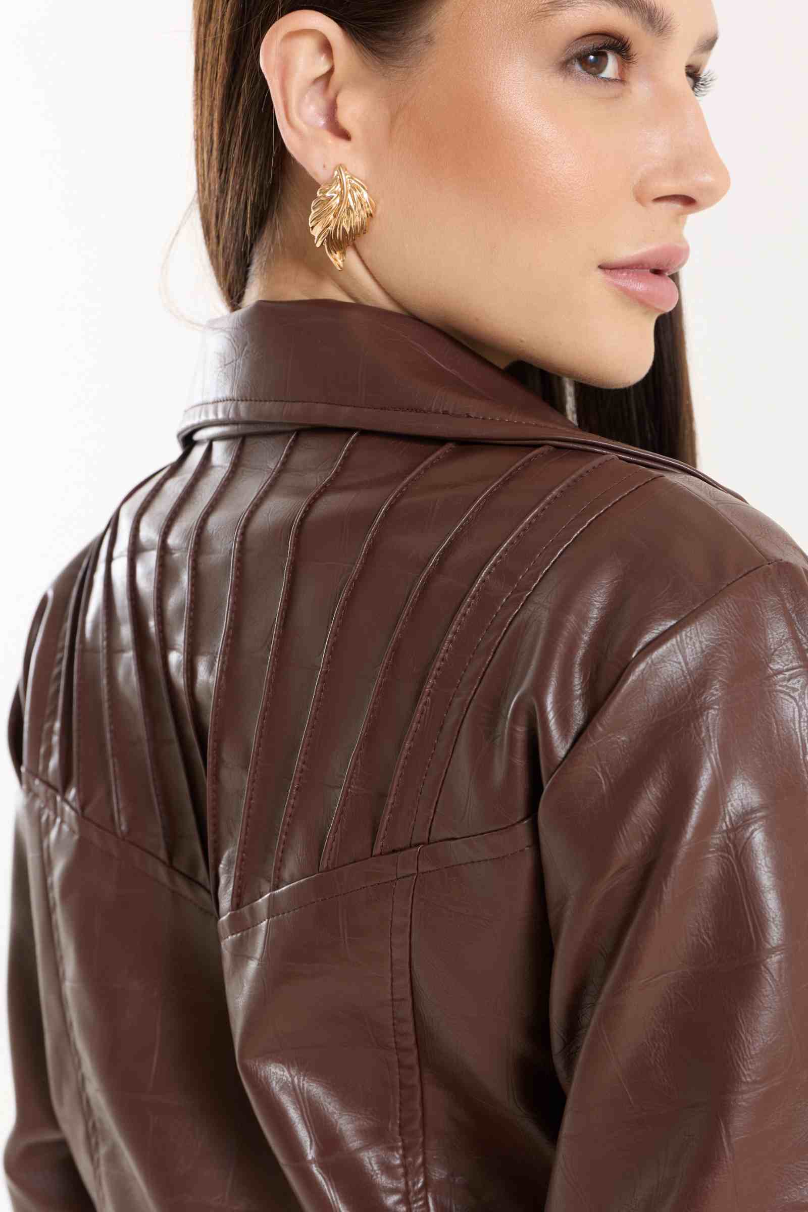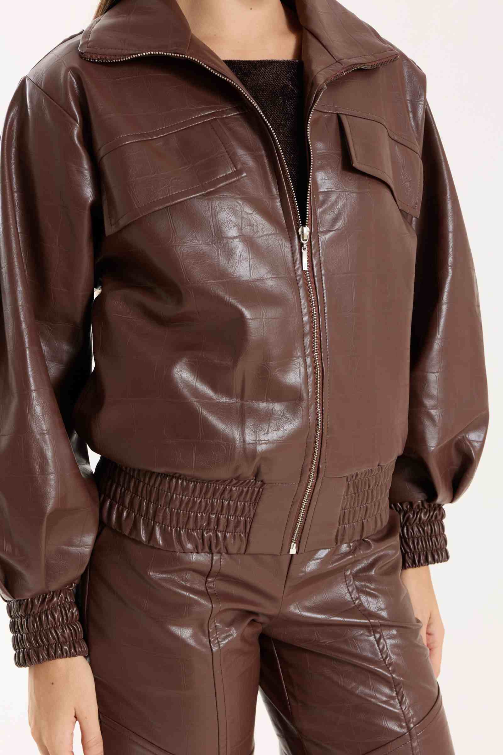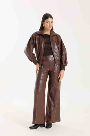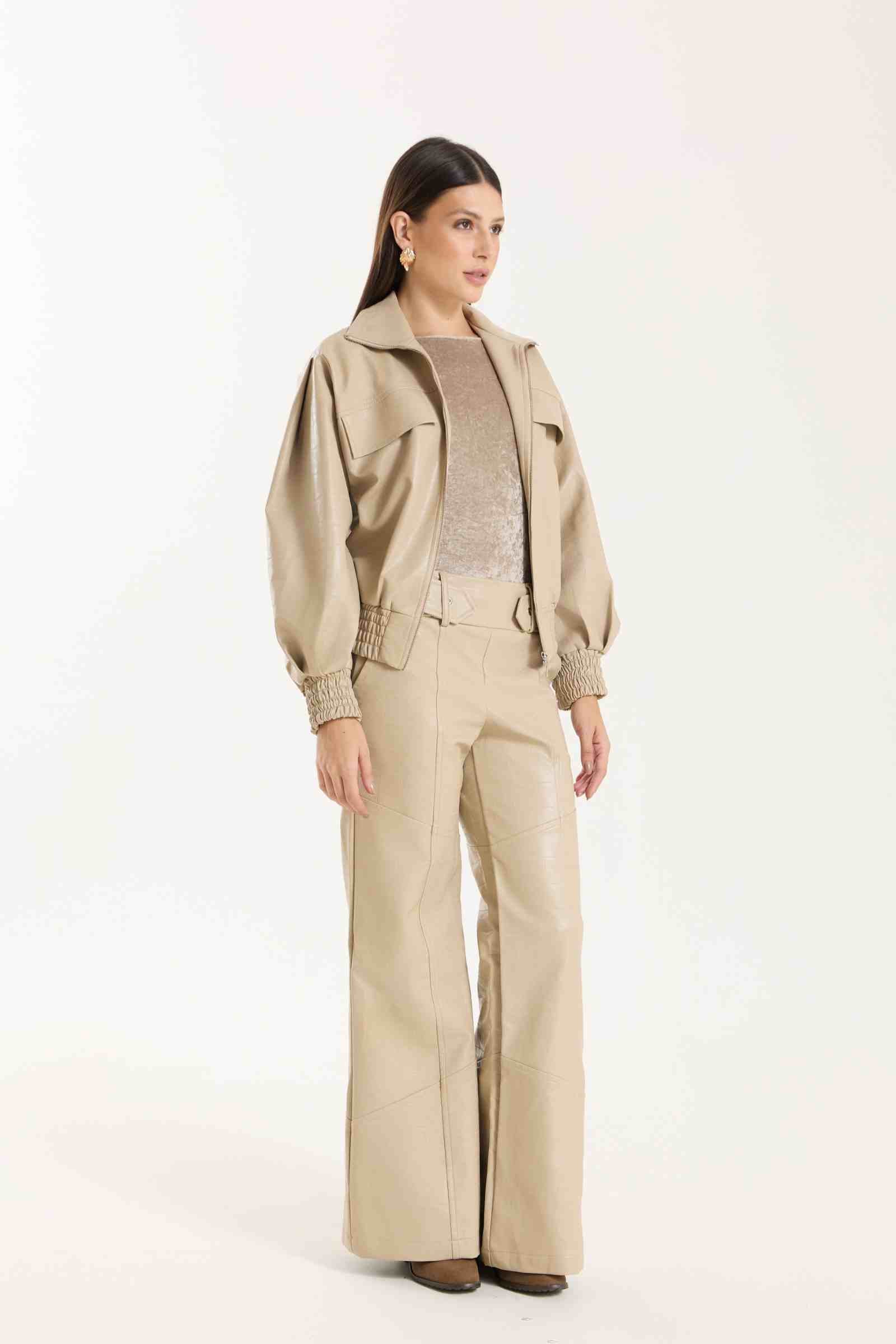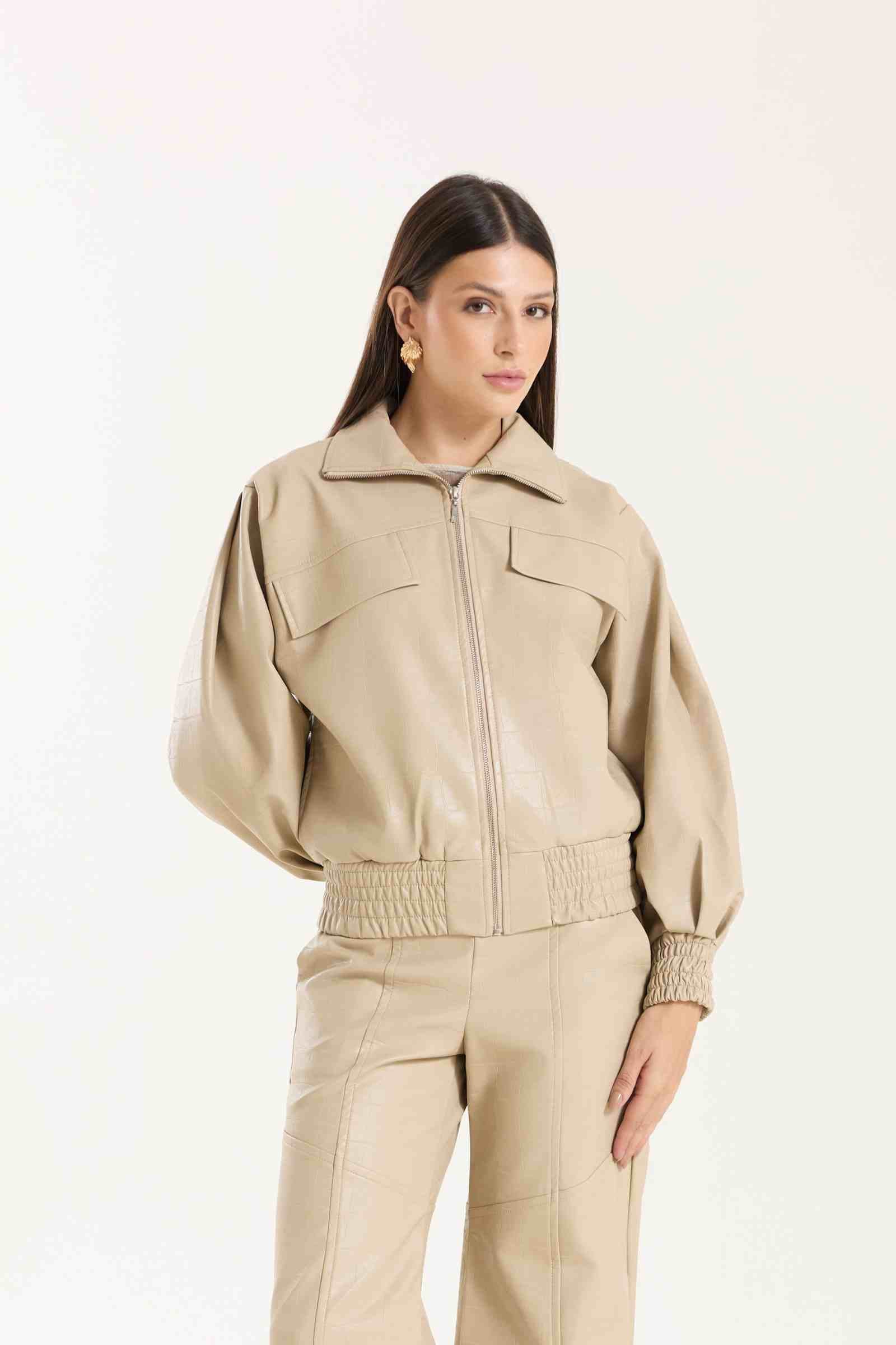 Jaqueta Victoria com modelagem oversized. Possui punhos com lastex, bolsos funcionais e detalhe em nervuras que agregam destaque e identidade à peça. Confeccionada em material com aspecto de couro, com base 100% viscose, oferecendo estrutura e acabamento sofisticado.