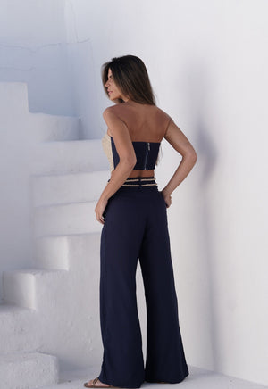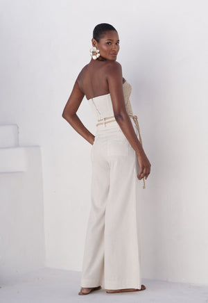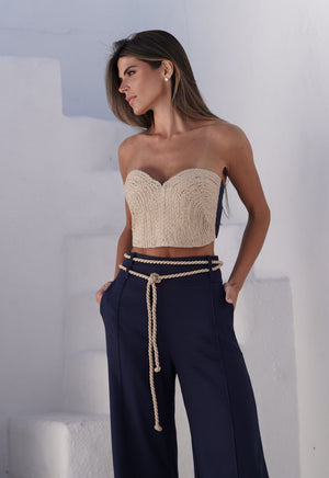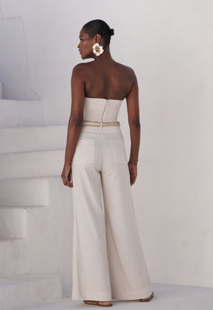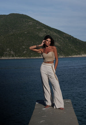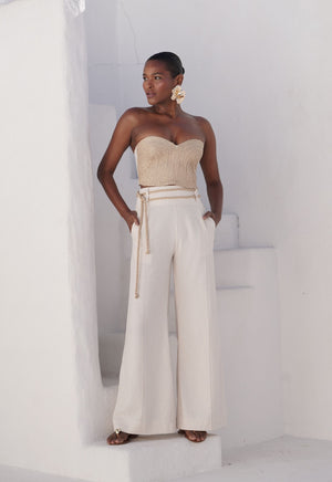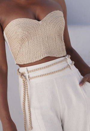 estruturado impecável e conforto no uso. O grande diferencial está no cós acompanhado de uma amarração com corda trançada aplicada à mão, que traz um charme rústico-chique e destaca a proposta natural da coleção.