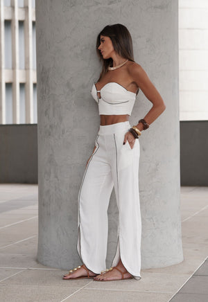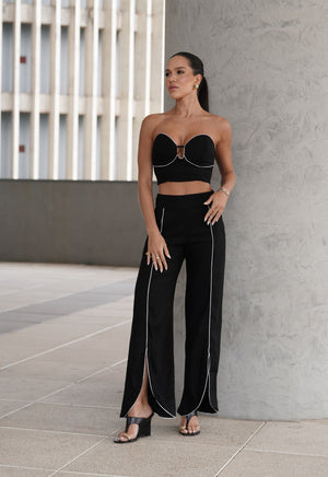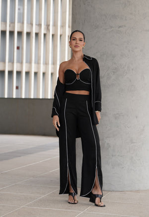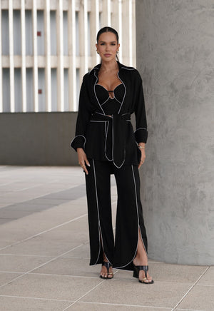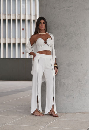 Os detalhes que chamam atenção é a peça toda de viés contrastante no preto e branco. É uma calça coringa no guarda-roupa e transita com facilidade entre produções casuais e elegantes. Para um visual completo, use com a Camisa Teresa e o top Teresa, compondo um look monocromático fresco.
