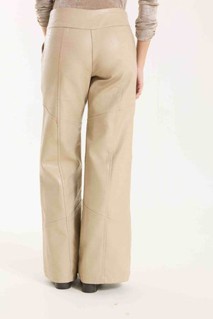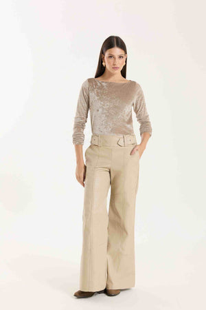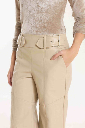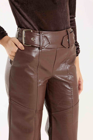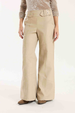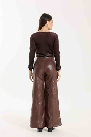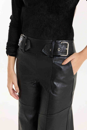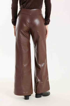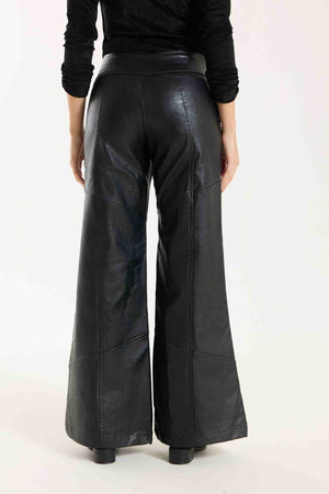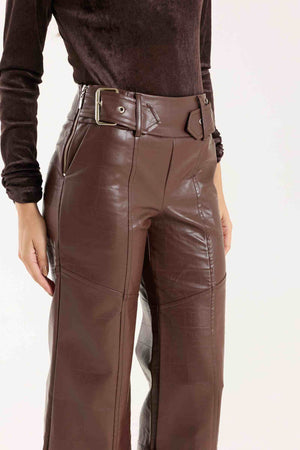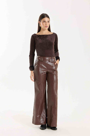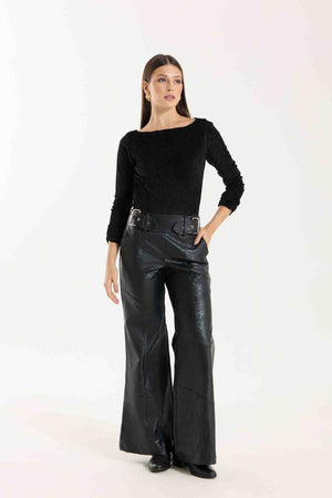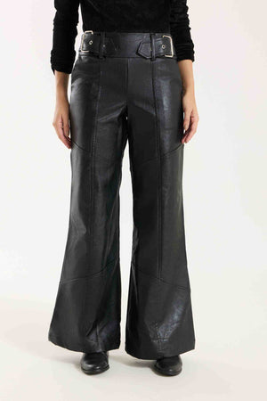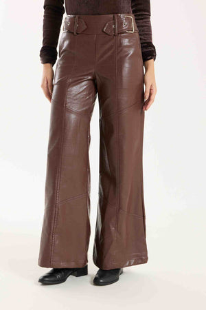 Calça Victoria com modelagem pantalona. Possui bolsos funcionais, cós detalhado com passantes e fivelas e recortes ao longo das pernas que agregam destaque e identidade ao design da peça. Confeccionada em material com aspecto de couro, com base 100% viscose, oferecendo estrutura e acabamento sofisticado.